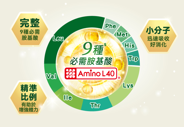 完整9種必需胺基酸,日本頂級胺基酸公司開發配方,擁有日美多項專利認證。精準比例有助於增強體力,小分子迅速吸收好消化