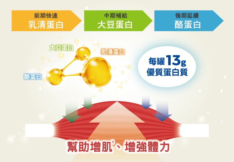 每罐提供13g優質蛋白質。精選3重優蛋白分階段吸收:乳清蛋白快速吸收,幫助肌肉生長*。大豆蛋白及酪蛋白持久作用**,增強體力。*桂格完膳3重優蛋白添加蛋白質,蛋白質為肌肉合成的來源之一,可用於肌肉生長